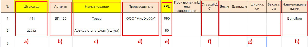 Желтые столбцы обязательны для заполнения (за исключением ШтрихКода, его заполнять не нужно, если хотите сгенерировать новый ШК для товара)